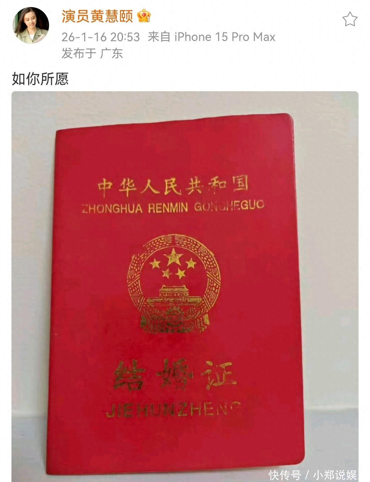 1�日晚上,和保剑锋�多年感情纠葛的黄慧颐,再也忍不了了,她郑重的在社交平台写下四个字:“如你所愿”,同时晒出了一本红色的结婚证。